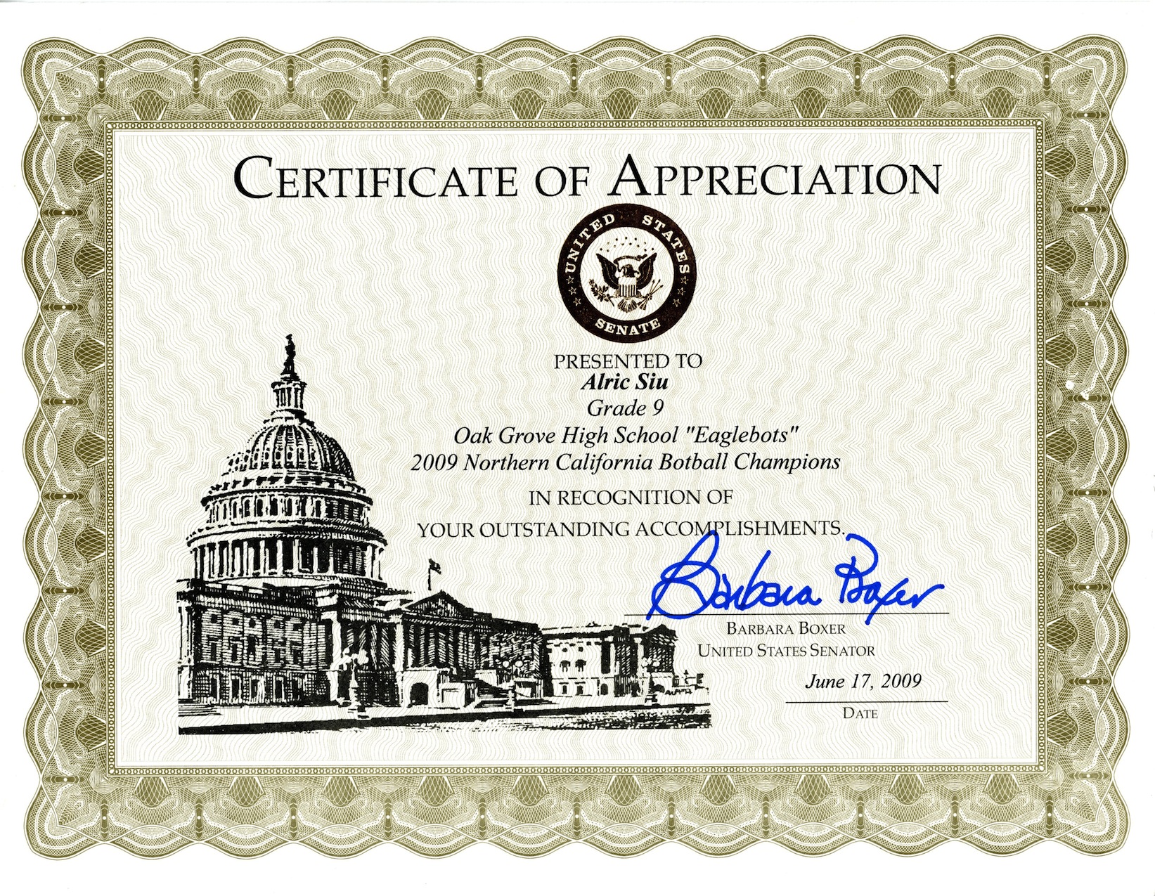 Certificate of Appreciation from United States Senator Barbara Boxer