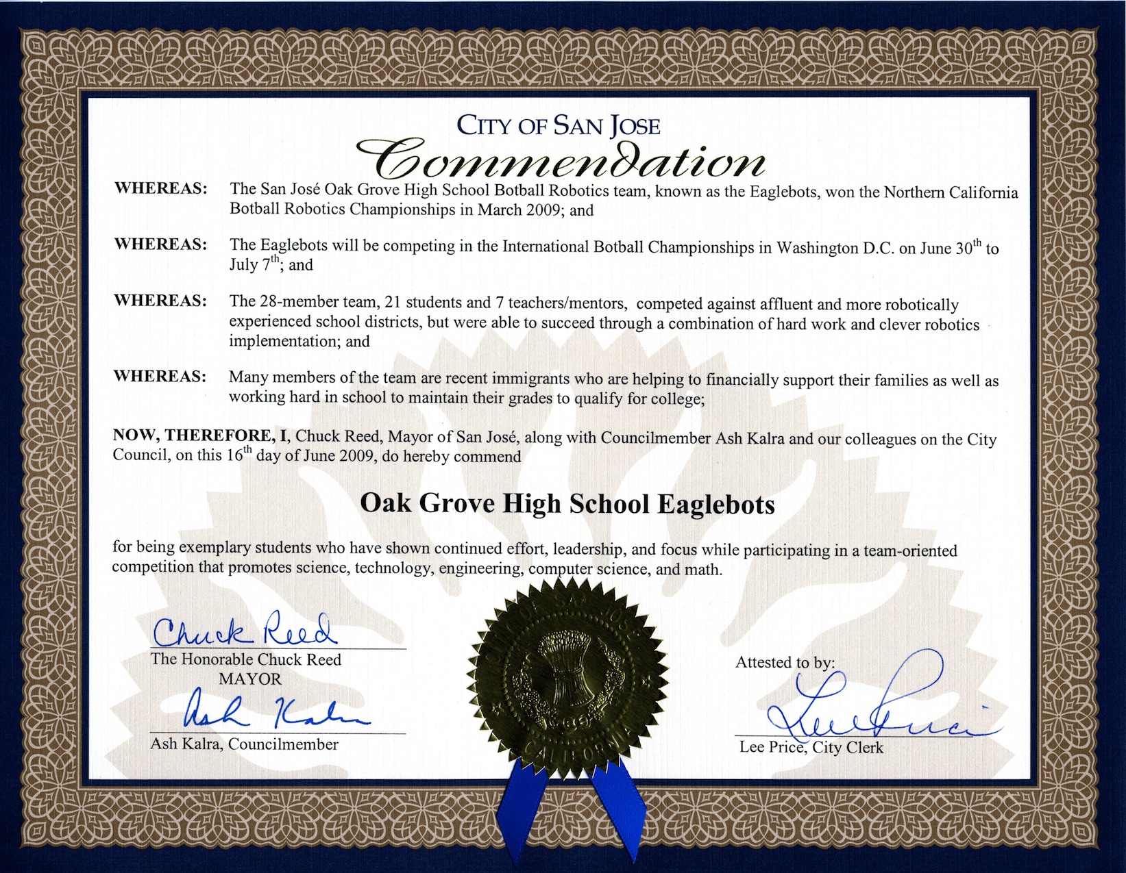 Commendation from the City of San Jose, CA