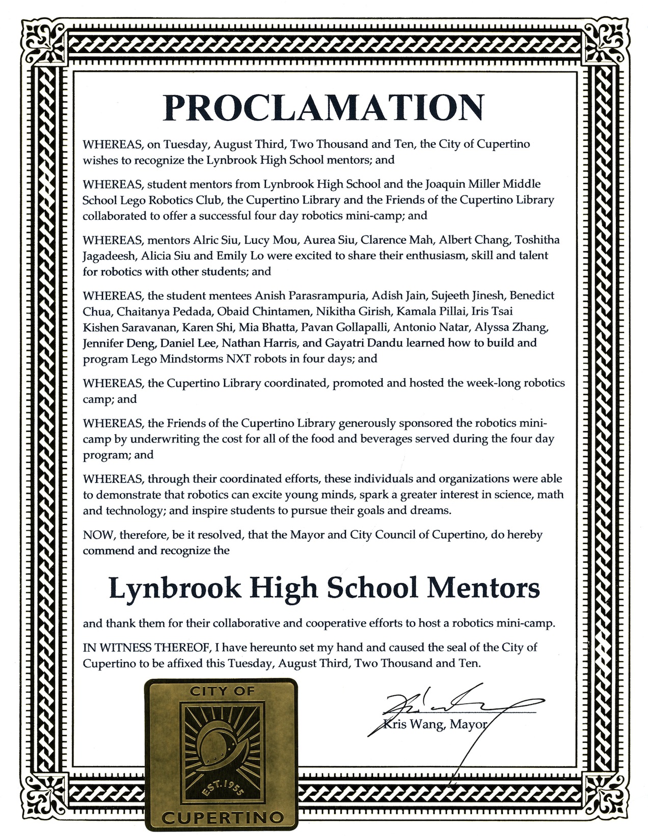 Proclamation from the City of Cupertino, CA